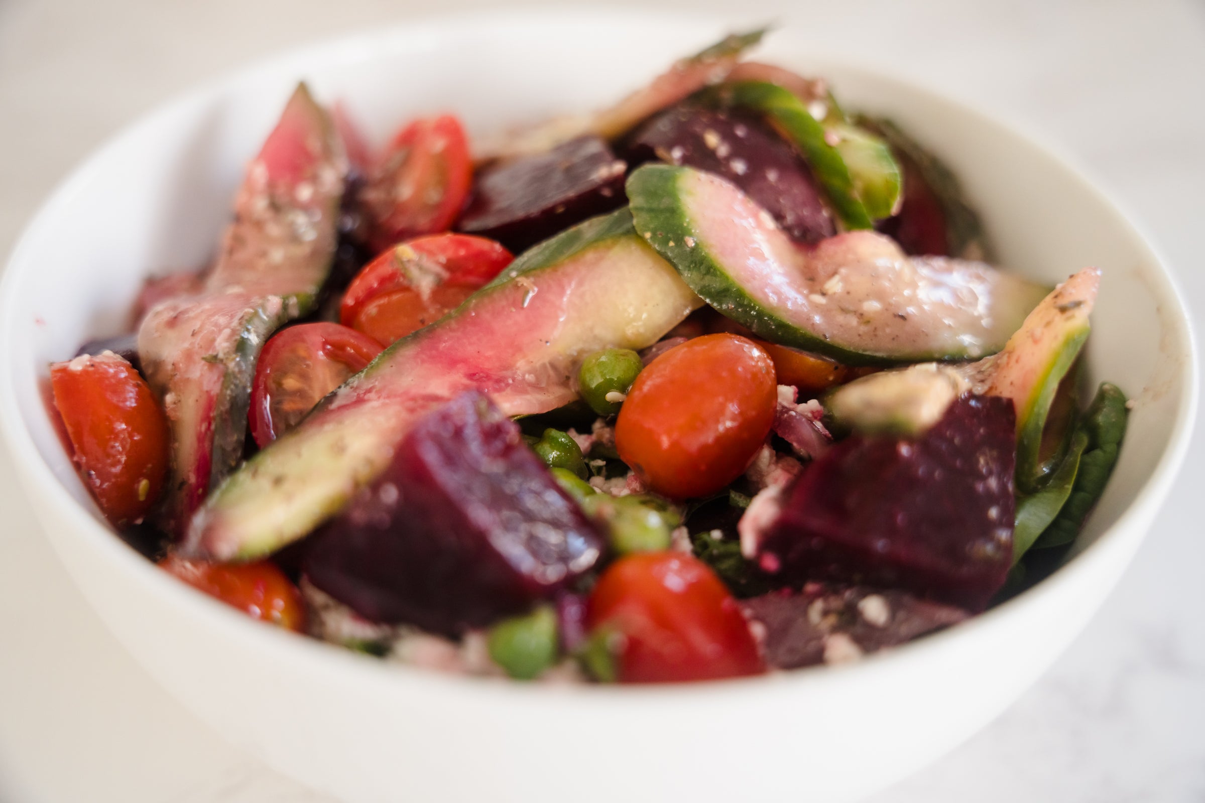Roasted red beets, cucumbers, heirloom cherry tomatoes, green garbanzo beans, pickled red onions & crumbled feta cheese on a bed of mixed greens dressed with Za’atar infused red wine vinaigrette.